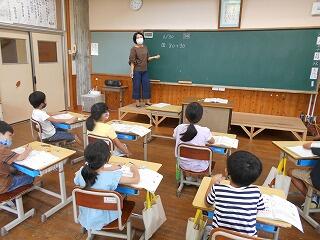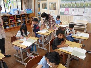 1年生が、夏休み中に各家庭で観察とお世話をしていた「あさがお」からとれた種を確認しながら、生活科の学習をしていました。たくさんとれていたようで、「こんなにとれたよ。」と見せてくれました。2年生は、生活科で1年生を招待して遊ぶための道具を考えていました。4~6年生は、リレーのバトンの練習でした。どの子もがんばっていました。