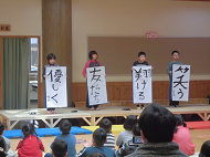3番目は、2・3年生。初めに2年生が、国語の教材「名前をみてちょうだい」の音読劇を、続いて3年生が、書道パフォーマンスで一人ずつ自分の思いや願いを込めた言葉を書いてくれました。最後に、全員、体育の得意技の披露もあり、まさに「ステップアップ2・3年生~伸びた自分を見せる~」というテーマ通りの発表となりました。
