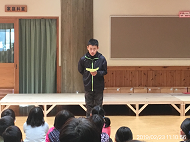 今日は、その「ニチバン株式会社」の本部から2名の方が来校され、5校時に全校の子どもたちを前に出前授業をしてくださいました。