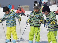 今シーズンは暖冬でスキー場にもほとんど雪が降らず、雨も多くて造雪した雪も融けてゲレンデも縮小。加えて前々日も夜に結構な雨が降りましたが、スキー場の「十分にスキー教室は可能」、という情報で実施することにしました。案の定、スキー場に上がるまでの山々にはまったく雪はなく、一面茶色や緑の景色でした。しかし、スキー場に到着すると滑る範囲には一面の雪。子どもたちからも「雪だー!」と喜びの声が。