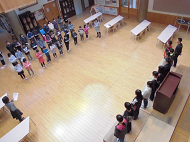 今日の練習は、会場となる多目的ホールでの一人一人の位置の確認と、卒業生と在校生による「門出の言葉」の呼びかけの練習でした。初めての練習で「門出の言葉」もまだ原稿を見ながらの状態でしたが、みんな集中して取り組みました。