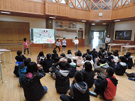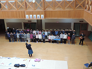 はじめに多目的ホールで、運営委員会が計画した6年生との「お別れ集会」がありました。1~5年生が6年生への感謝とお祝いを込めて発表をしました。
