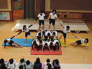 体力つくり運動の4つの縦割り班で、6年生がリーダーとなり、「ボウリング」・「輪投げ」・「まちがいさがし」・「これは何?」・「ジェスチャー」の5つのチェックポイントを回りました。どのポイントも5年生がよく工夫していて、みんな楽しく回っていました。高得点を取ると、大歓声が上がっていました。4班とも、仲良く協力して回っていました。