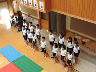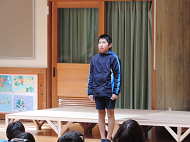 続いて、1年生の発表でした。1年生は、国語の時間に学習したことを発表してくれました。最初に、神沢利子さんの詩「みみずのたいそう」を体操の動きを入れながら元気な声で朗読しました。次に、自分たちで考えたジャンケンの発表でした。「パンダ・うさぎ・ねこ」の3つでジャンケンするそうです。模造紙にかいた図も指し示しながら、勝ち負けの理由もしっかり教えてくれました。「パンダは体が大きいのでうさぎに勝つ」、「うさぎは耳が長いのでねこに勝つ」「ねこは動きが素速いのでパンダに勝つ」そうです。なかなかおもしろいですね。そして、ジャンケンで出す手の形も、それぞれの動物の特徴を表して工夫していました。最後に、1年生と全校みんなで「動物ジャンケン対決」をしました。4回戦までありました。とても楽しかったですよ!