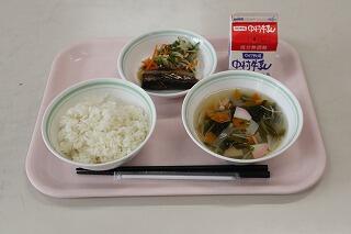 麦ごはん、牛乳、いわしのしょうが煮、もやしの酢の物、豆腐のすまし汁