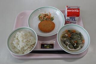 麦ごはん、牛乳、日向鶏コロッケ、もやしの和え物、野菜のそぼろ汁