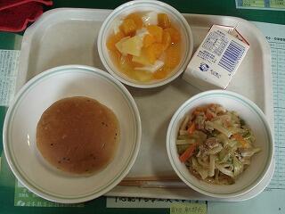 今日の給食は『焼きうどん、杏仁豆腐』でした。焼きうどん