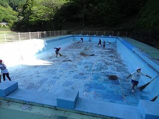 5月24日(水) 26日のプール掃除の前に、3・4年生が、プールの底に残っていた落ち葉を片付けてくれました。
