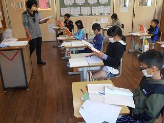 今月は、秋の読書月間です。それで、朝の読み聞かせを図書委員の子どもたちが行っています。それから、5・6年生が、ミシンを使っての活動をしていました。新しい電動ミシンを使っての作業ですが、ちょっとおっかなびっくりとした様子で作業をしていました。慣れないうちは、とても慎重な子どもたちでした。