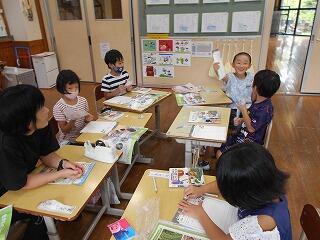 1年生が、夏休み中に各家庭で観察とお世話をしていた「あさがお」からとれた種を確認しながら、生活科の学習をしていました。たくさんとれていたようで、「こんなにとれたよ。」と見せてくれました。2年生は、生活科で1年生を招待して遊ぶための道具を考えていました。4~6年生は、リレーのバトンの練習でした。どの子もがんばっていました。