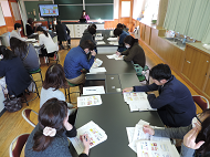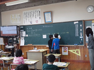 1年生は体育館で体育。なわとびをしたり、お母さん方と一緒にハンカチ取りゲームをしたり、元気に楽しそうに走り回っていました。2・3年生は音楽。唱歌「ふじ山」で自分なりの富士山を描いて歌ったり、リコーダーや鍵盤ハーモニカの合奏したり、音楽を楽しんでいました。4年生は算数の「分数」。1より小さな分数・大きな分数・等しい分数の仲間分けの学習でした。みんなしっかりマスターできたようです。