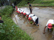 最初は、泥で汚れないようにと慎重に田植えしていた子どもたちも、泥に足を取られて倒れるなどして多少身体が汚れてくると、今度は、それが楽しみに変わった様子。最後はほとんどの子どもたちが下半身泥だらけ、顔にも泥のおしろい?を付けている子どももいました。それでも、何とか無事、賑やかに田植えを終了することができました。