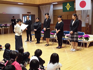 はじめに新任式を行いました。本年度、押方小に来てくだった5名の先生方お一人ずつあいさついただいた後、6年生の代表が歓迎の言葉を述べました。