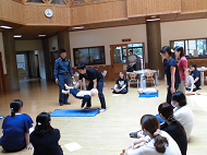 3校時は、多目的ホールで、夏休みのプール監視に向けた保護者対象の心肺蘇生法講習を行いました。4名の消防署員から、胸骨圧迫からAED使用までの一連の流れについて説明を受け、グループに分かれてダミーを使って訓練してもらいました。子どもサイズの人形を使って、おぼれた子どもを助けるまでの流れも学ばせていただき、また、プール監視員の役割についてもお話しくださいました。