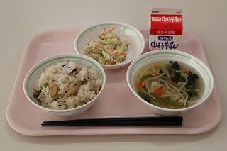 きのこごはん、牛乳、おからサラダ、魚そうめん汁