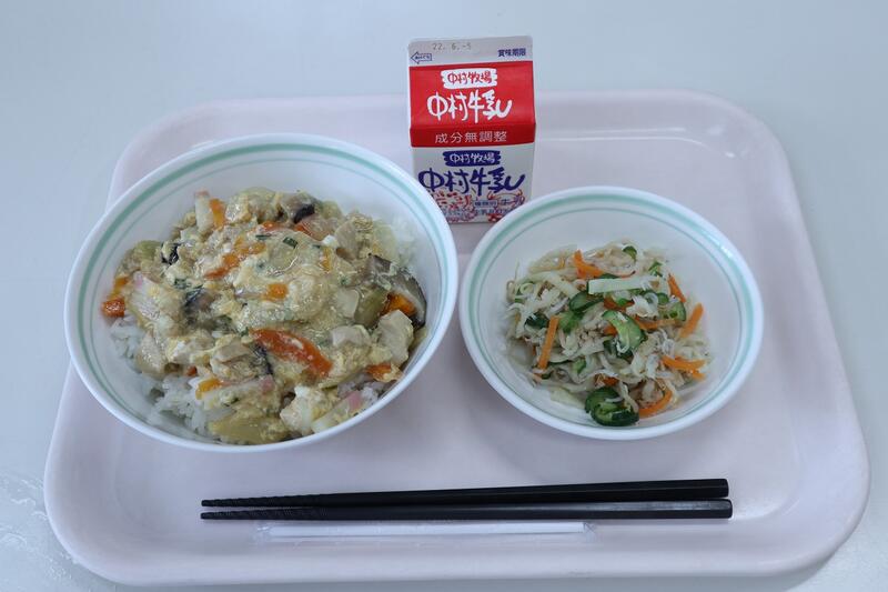 麦ごはん、牛乳、ちくわの磯辺天ぷら、昆布和え、はちはい汁