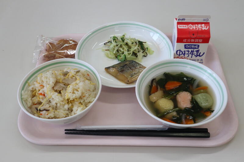 五目寿司、牛乳、さわら西京焼、昆布和え、野菜つみれ汁、こどもの日デザート