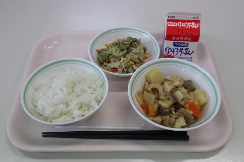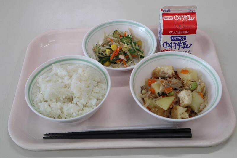 麦ごはん、牛乳、じゃがいものそぼろ煮、ごぼうとツナのサラダ