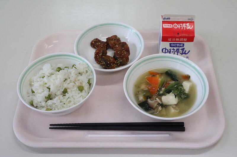 えんどうご飯、牛乳、揚げかつおの香り和え、みそけんちん汁