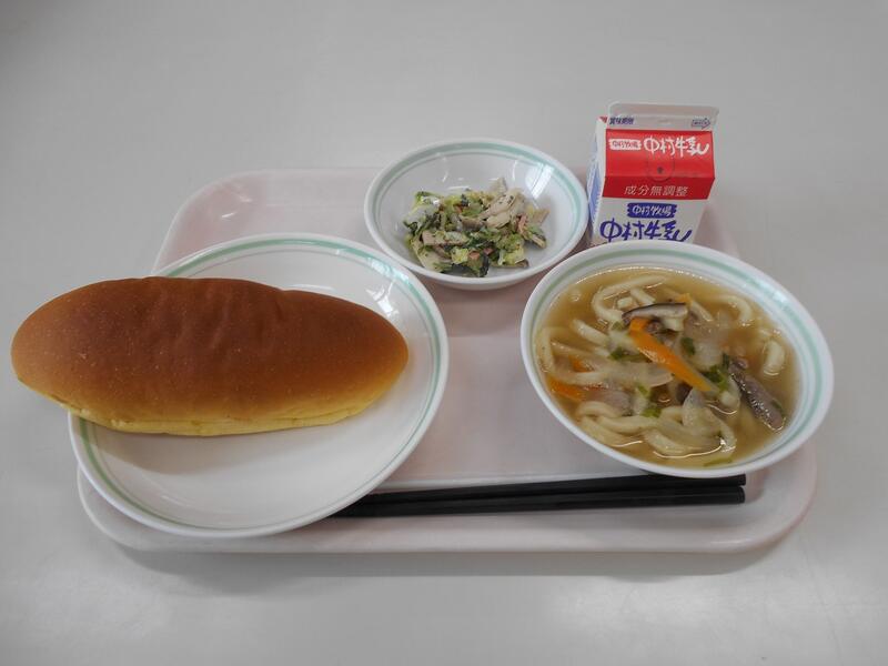 キャロットパン、牛乳、肉うどん、いそマヨネーズあえ