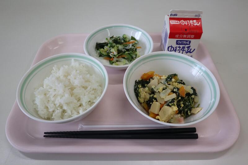 高野豆腐の卵とじ、牛乳、麦ごはん、じゃこ和え