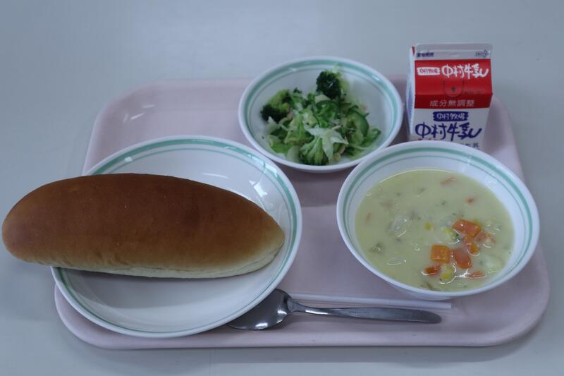 黒糖パン、牛乳、コーンシチュー、ブロッコリーのサラダ