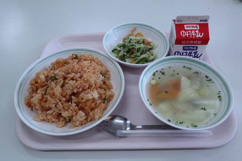 チキンライス、牛乳、ベーコンスープ、ツナサラダ