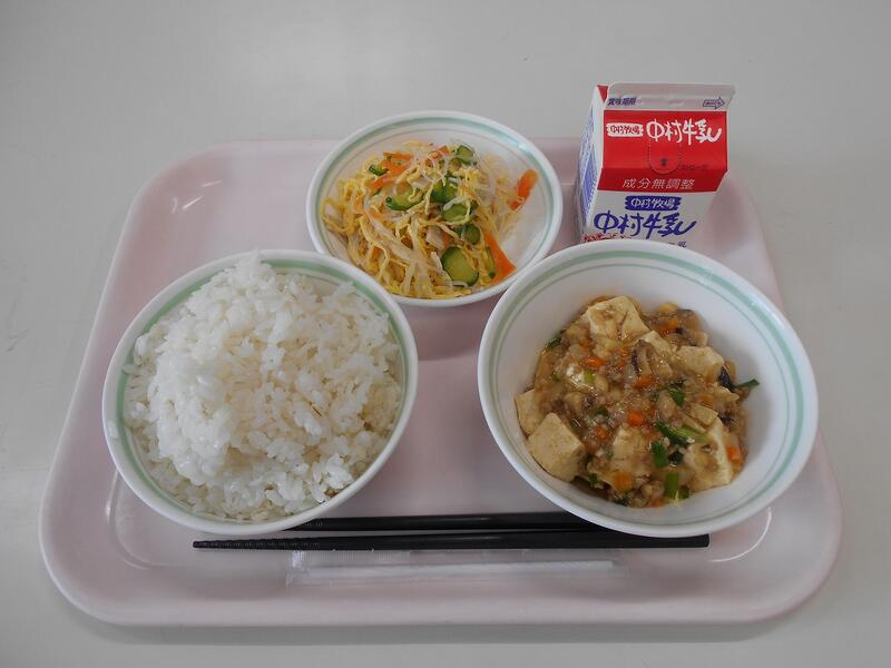 麻婆豆腐、麦ごはん、バンサンスー、牛乳