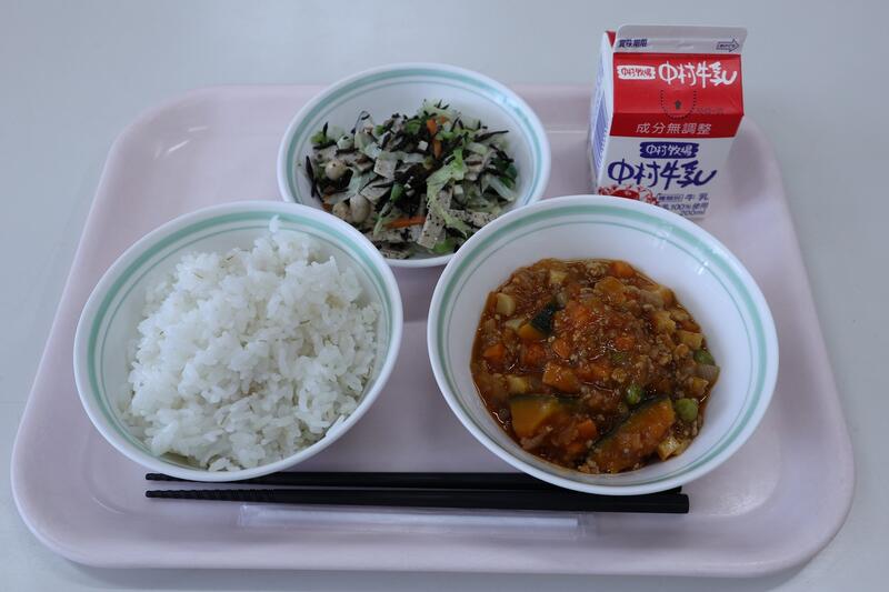 ドライカレー、牛乳、ツナとキャベツの炒め物