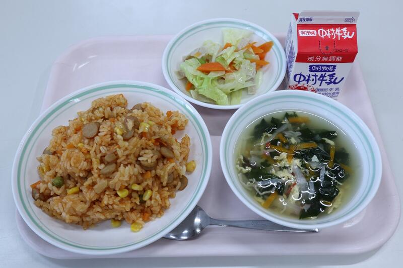 メキシカンライス、キャベツとハムのソテー、卵とほうれん草のスープ、牛乳