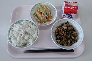 高野豆腐と昆布の炒り煮、ツナとキャベツの炒め物、麦ごはん、牛乳