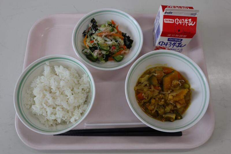 かぼちゃのそぼろ煮、わかめの酢の物、麦ごはん、牛乳