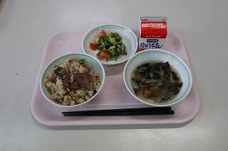 高千穂牛の混ぜご飯、牛乳、マロニースープ、高千穂どれサラダ