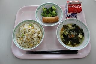 さつまいもごはん、牛乳、焼き肉、わかめスープ