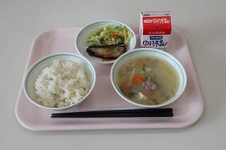 麦ごはん、牛乳、いわしの甘露煮、野菜のレモン和え、豚汁