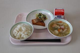 セルフおにぎり、牛乳、さばの塩焼き、かぶの酢の物、みそ汁