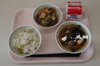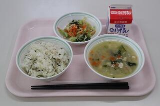 鯛飯、牛乳、野菜のごまあえ、白南瓜のみそけんちん汁(ぬくもりランチ)