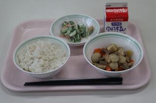 麦ごはん、牛乳、鶏肉のごまみそ煮、ちりめんの酢の物