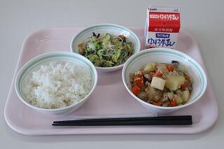 麦ごはん、牛乳、じゃがいものそぼろ煮、春雨の酢の物