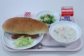 ホットドッグ、牛乳、白花豆ポタージュ、ブロッコリーサラダ