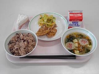 赤飯、牛乳、鶏肉のからあげ、野菜のレモンあえ、すまし汁、お祝いデザート(ぬくもりランチ)