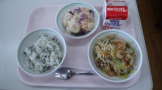 減量わかめごはん、牛乳、炒めビーフン、フルーツヨーグルト