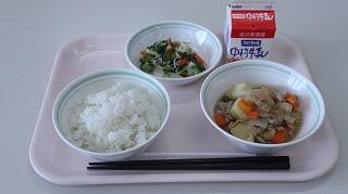 麦ごはん、牛乳、鶏肉とじゃがいもの揚げ煮、わかたけ汁