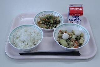 麦ごはん、牛乳、厚揚げの中華煮、りっちゃんのサラダ