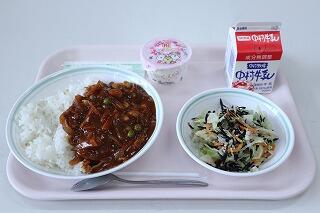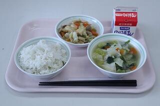 麦ごはん、牛乳、厚揚げの中華煮、りっちゃんのサラダ