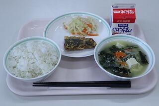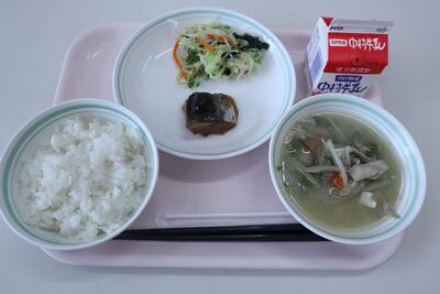 麦ごはん、牛乳、さば生姜煮、小松菜のおひたし、豚汁