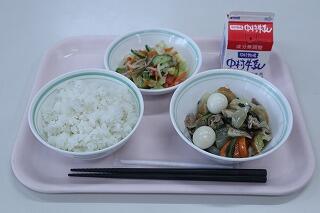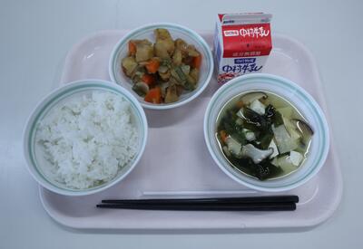 麦ごはん、牛乳、鶏肉とじゃがいもの揚げ煮、わかたけ汁
