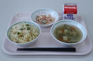たけのこごはん、牛乳、五目豆、すまし汁