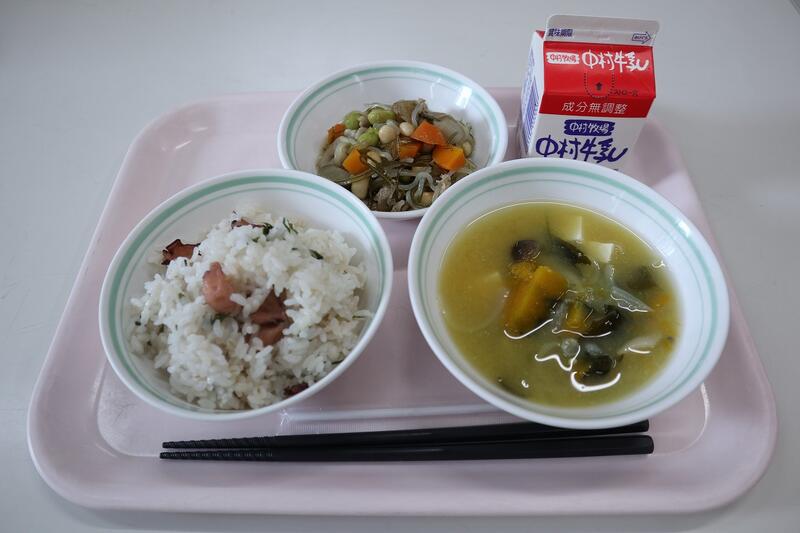 大和煮、かぼちゃのみそ汁、たこご飯、牛乳