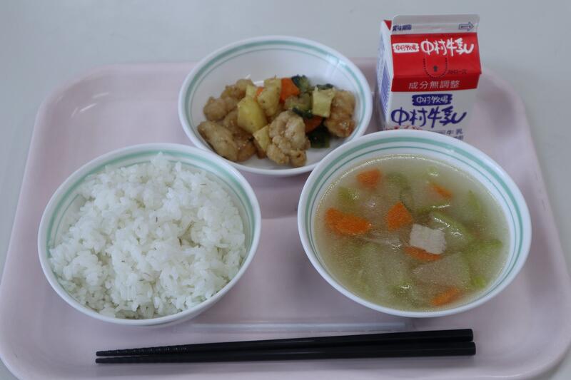 鶏肉とゴーヤの揚げ煮、とうがんスープ、麦ごはん、牛乳